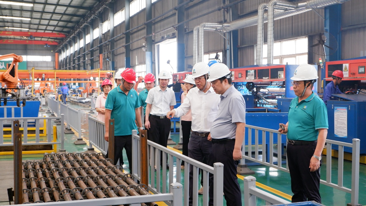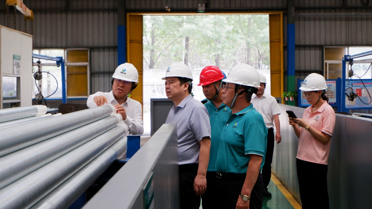 郭建君董事長陪同萬涌董事長先后調研參觀了綠能材料一車間、鍍鋅制造二車間、焊管制造二車間、水務總制造車間。萬涌董事長詳細觀看了新能源光伏結構支架材料全自動生產線、承插型盤扣式鋼管腳手架自動生產線、鍍鎂鋁鋅鋼管生產線、熱鍍鋅生產線、焊管生產線、襯塑復合鋼管生產線等在線生產流程,詳細詢問了生產工藝與專業技術,認真了解產品用途與對應客戶群體,對車間現場管理、產品開發使用、公司發展前景給予肯定認同。